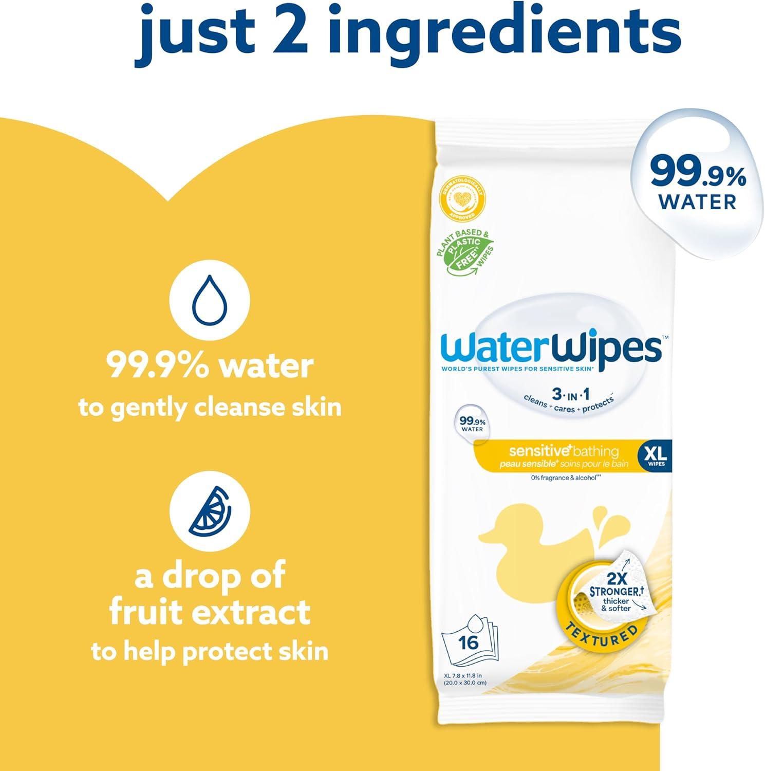 PURE, SIMPLE FORMULA FOR GENTLE SKIN CARE: Our bundle includes fragrance-free WaterWipes Original and XL Bathing Wipes, made with 99.9% purified water and a drop of fruit extract, for gentle cleaning and protection of delicate baby skin.