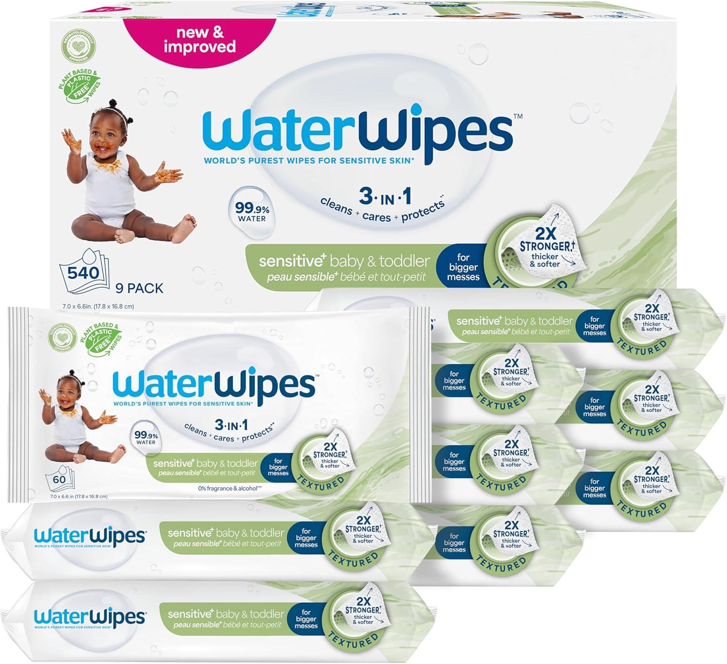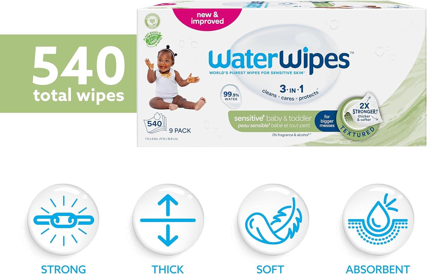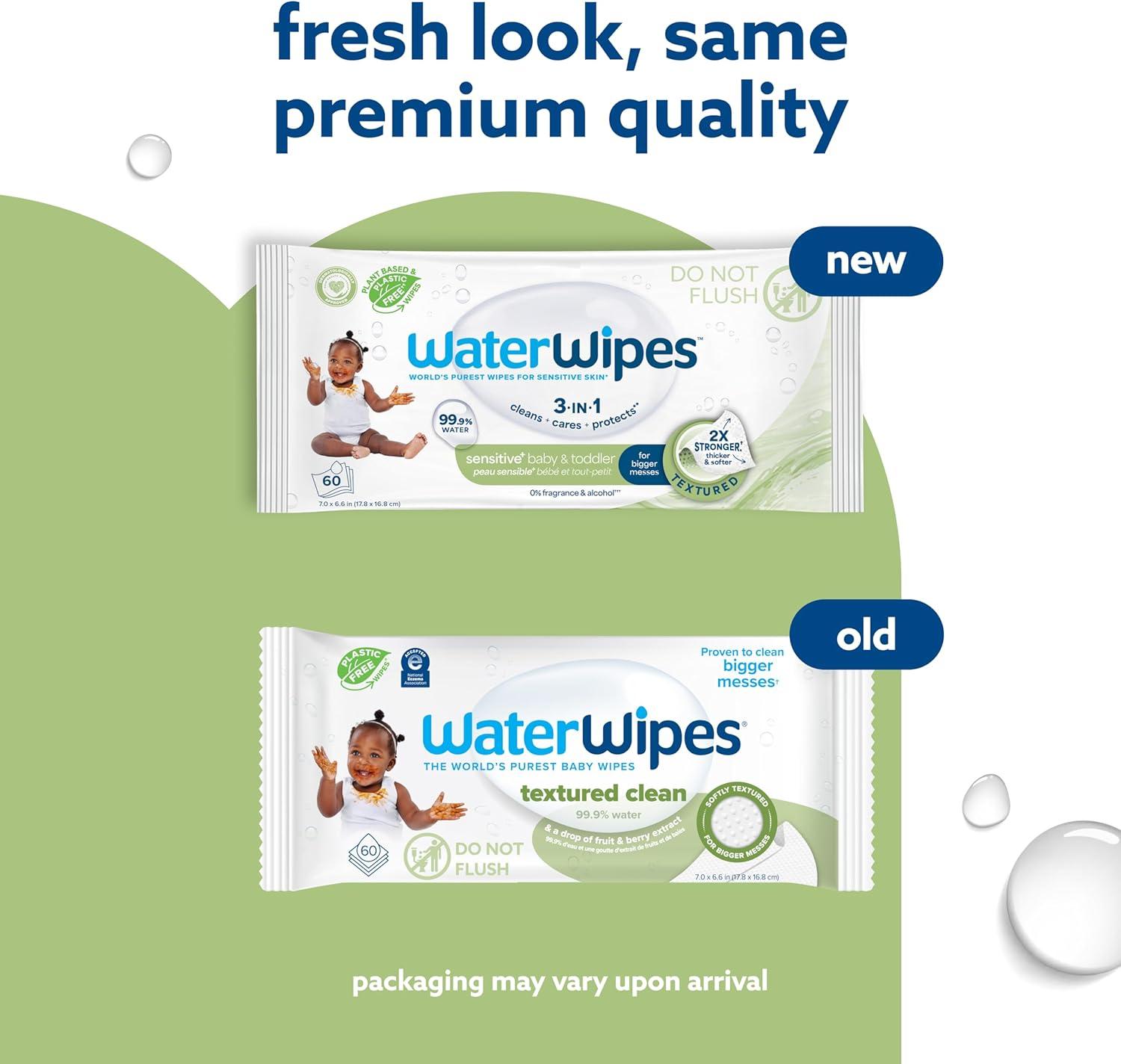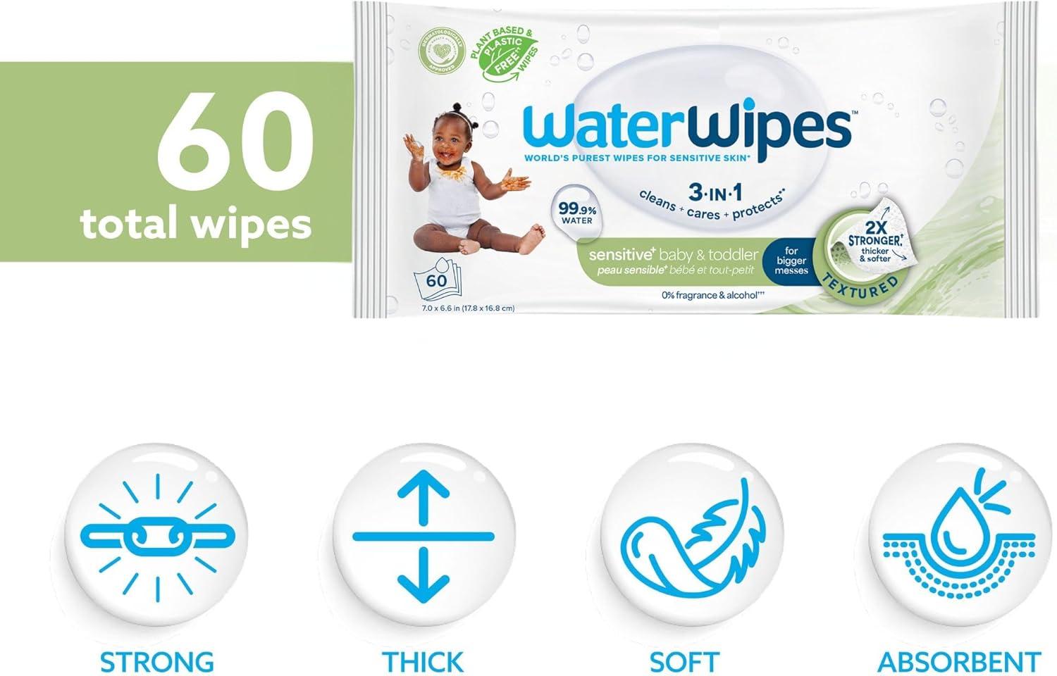 WaterWipes Sensitive+ Baby & Toddler Wipes, 3-In-1 Cleans, Cares, Protects, 99.9% Water, Textured Clean, Unscented & Hypoallergenic, 1080 Count (18 Packs)(Unscented)